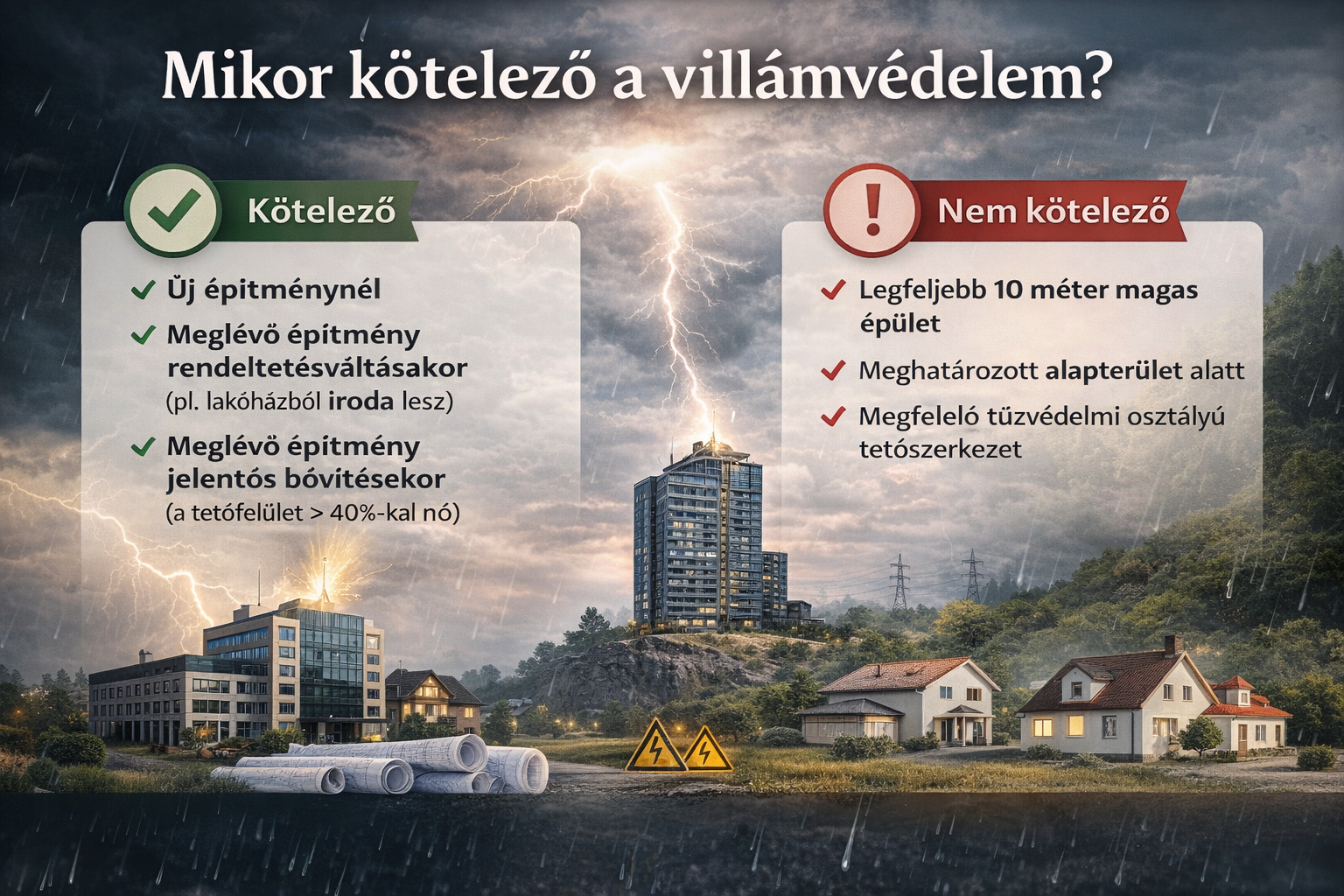 A villámvédelemmel kapcsolatos kötelezettségek nem minden épületre vonatkoznak automatikusan. Az, hogy kell-e villámvédelmi rendszer, illetve szükséges-e annak felülvizsgálata, az adott épület jogi és műszaki jellemzőitől függ.